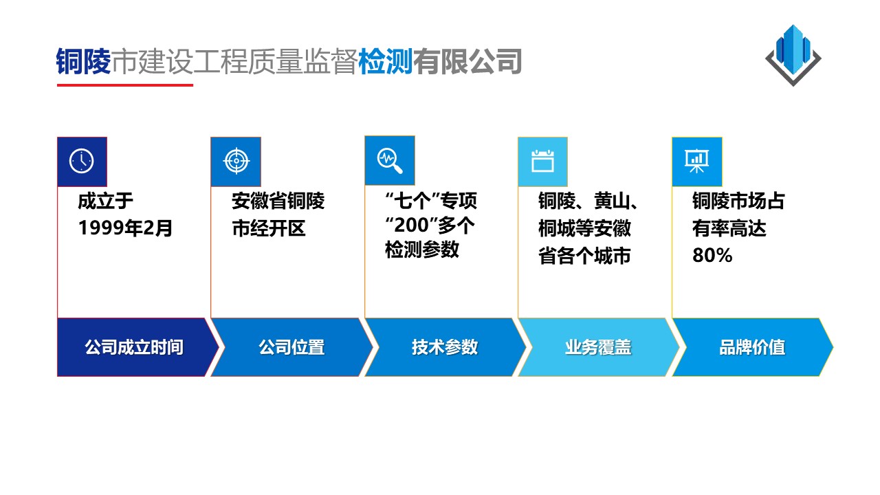近年來,在各級領導的重視和關懷下,銅陵市建設工程質量監督檢測有限公司堅持以“規范、發展”為主題,加快技術改造,公司技術人員專業技術水平不斷提高,專項檢測儀器和設備不斷更新完善,工作準確高效,服務水平提高迅速,先后在本市參與多個大型建設項目和重點工程項目投建工作,與危房辦對市內多處危房進行危房鑒定檢測。并以銅陵為中心,向周邊主要城市擴展,其中包括黃山、池州、樅陽、南陵、桐城、淮北等市縣。